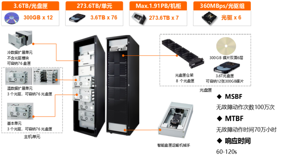 蓝光存储产品提供大容量、长寿命、低能耗、高安全、模块化的蓝光存储服务以及光磁融合存储服务,兼容性强,即插即用,是绿色数据中心价值数据长期保存、重要数据归档备份的理想产品。