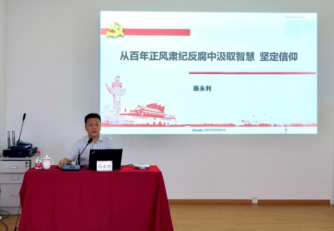 路永利围绕纪律、作风、监督和党建四大主题,通过剖析典型案例,以案释教、以案释纪、以案示警,重点讲述了党的纪检监察机关在百年党史中的历史沿革以及纪检监察制度的发展历程,带领大家重温了中国共产党的百年光辉历程,要求党员干部们从百年正风肃纪反腐中汲取智慧,不忘初心、牢记使命,坚定共产主义和社会主义的信仰信念。