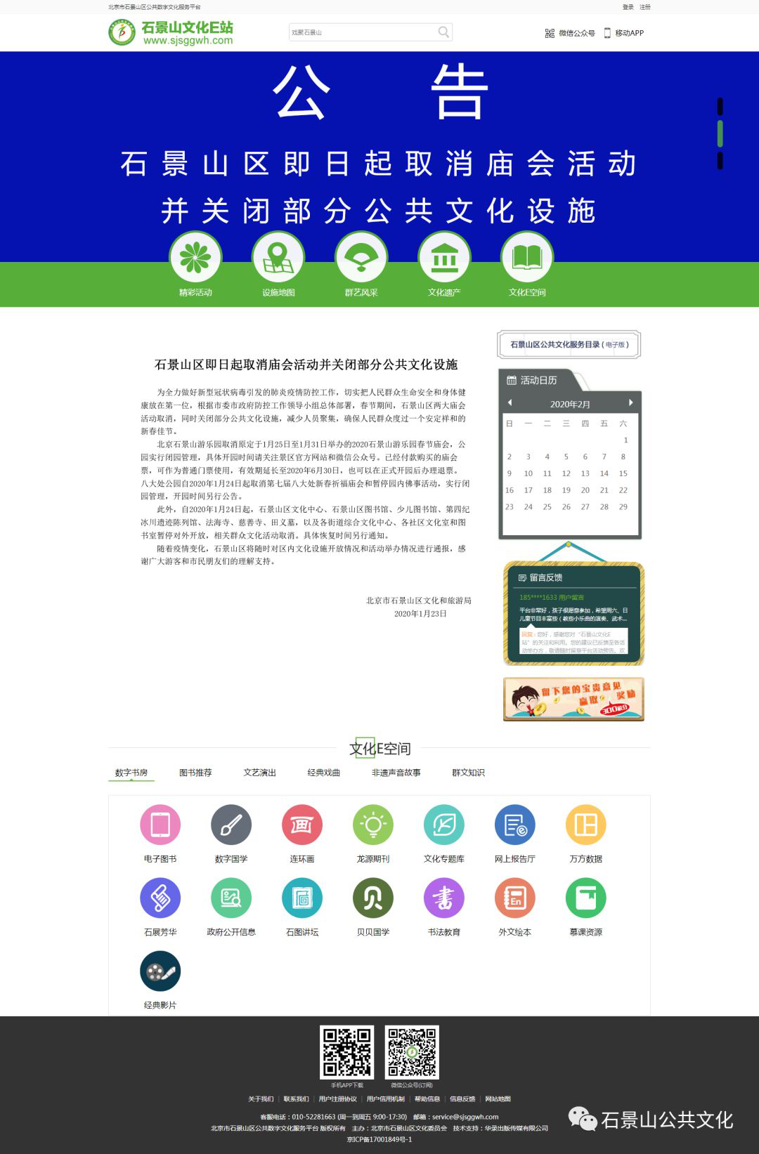 疫情发生以来,北京市石景山区公共数字文化服务平台在第一时间通过网站、手机APP、微信公众号等渠道及时发布通知公告,关闭区、街、社区三级公共文化设施场馆、文物保护单位、旅游景区及所有文化娱乐场所,停止举办集中性文化活动。