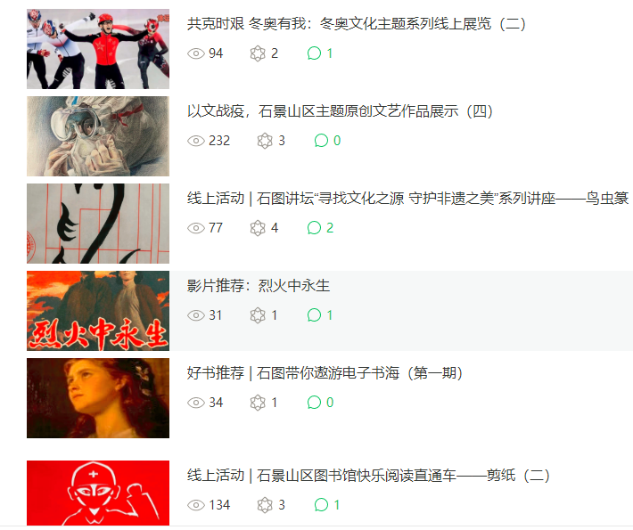 通过“石景山公共文化”微信公众号发布抗击疫情文化内容,系列主题板块如下: