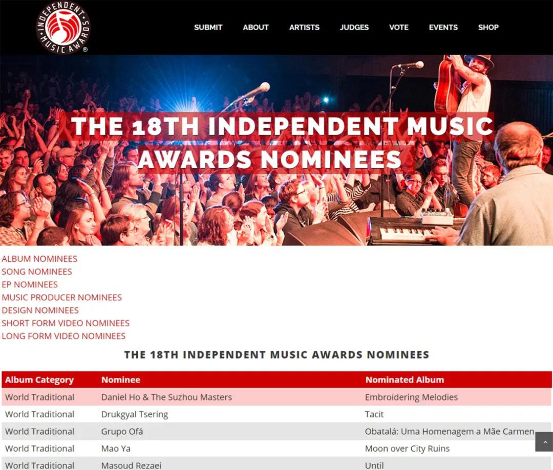 全美独立音乐奖(IMA)官方网站公布《水绣》提名