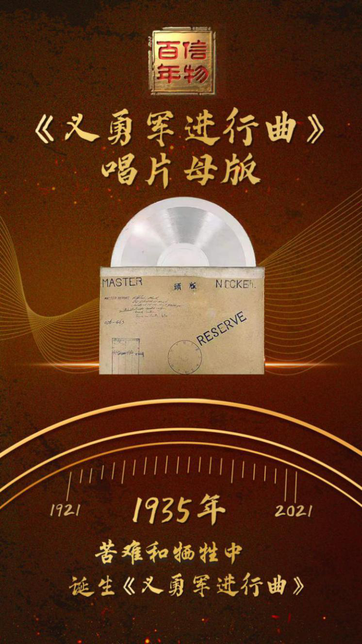 《义勇军进行曲》诞生于民族危亡之际的1935年,原是故事片《风云儿女》的主题歌,由田汉作词、聂耳作曲。1935年5月3日,在时任上海百代唱片公司音乐部主任的任光的主持下,百代公司邀请电通公司歌唱队,包括袁牧之、顾梦鹤等上海文艺界进步人士共7人,在公司录音棚内录下了这首歌,并灌制了首版《义勇军进行曲》的唱片,上面有百代唱片公司独特的金鸡标识,唱片上的录音后被转录到影片《风云儿女》胶片上。同年5月24日,《风云儿女》首映,7月,首版《义勇军进行曲》唱片由百代唱片公司出版。歌曲一经问世,就在大江南北、长城内外广为传唱,激励着不愿做奴隶的中国人民“万众一心,冒着敌人的炮火前进”。