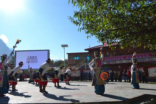 活动在欢快的工布舞蹈中拉开了序幕,身着节日盛装的当地村民们载歌载舞欢迎远道来访的客人及庆祝村里安装了高科技的卫星数字书屋。