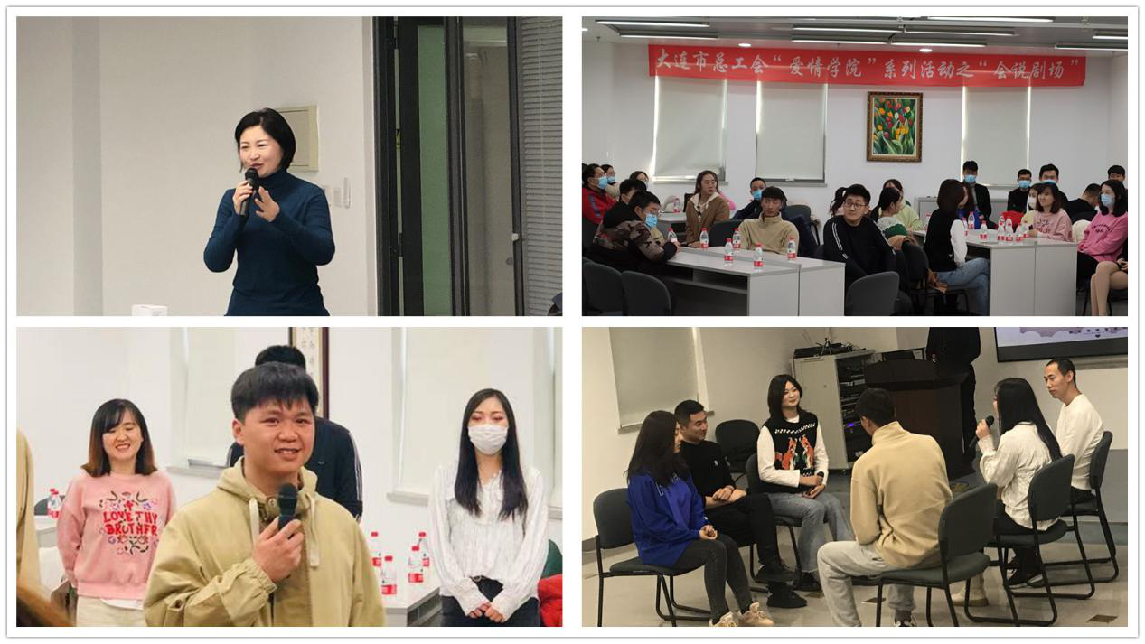 “会”说剧场是大连市总工会“爱情学院”系列活动之一,以即兴戏剧的形式,就现今婚恋交友过程中的热点话题进行现场表演,分组展示和讨论。本次活动,没有剧本,没有道具,没有舞台布景,参加活动的人员通过趣味游戏互动、即兴戏剧排演,在轻松、愉快的氛围中一起体验表演带来的乐趣,也在这次没有彩排的演出中,重新与自己相遇。
