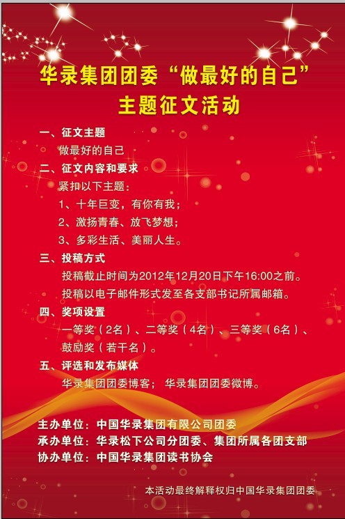 3、三等奖(6名):奖品价值100元,集团团委颁发获奖证书,并推荐到华录报发表。