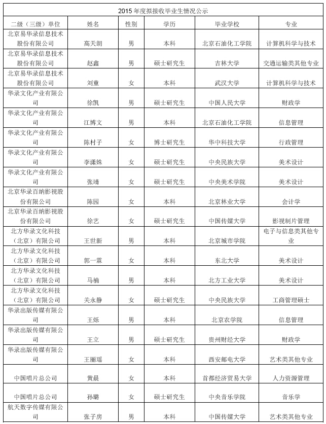 浏览查询公示信息请点击:2015年度拟接收毕业生情况公示。
